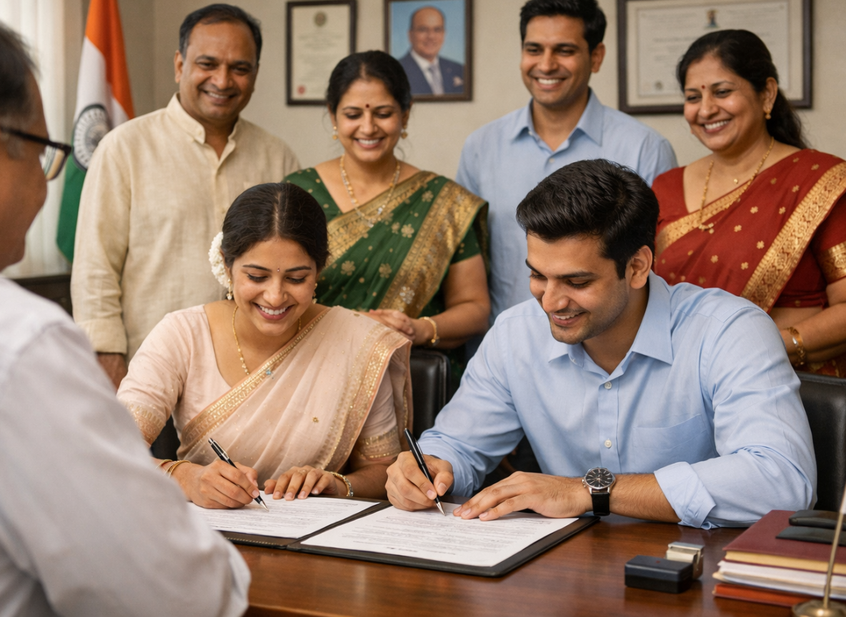 Court Marriage is a legally recognized marriage process under Indian law for couples of any caste or religion.It ensures full legal validity, transparency, and protection of constitutional rights.This marriage is solemnized before a Marriage Officer through a formal legal procedure.